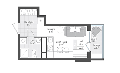 Квартира-студия - место, где легко обрести независимость, сосредоточиться на учебе или карьере и почувствовать себя по-настоящему дома. Планировка правильной геометрической формы позволяет максимально эффективно зонировать пространство и расставить мебель без "мертвых" зон. Этому способствует и ниша для гардероба, расположенная в прихожей. А просторный санузел позволит разместить и стиральную машину, и небольшой шкаф для хранения бытовых мелочей.